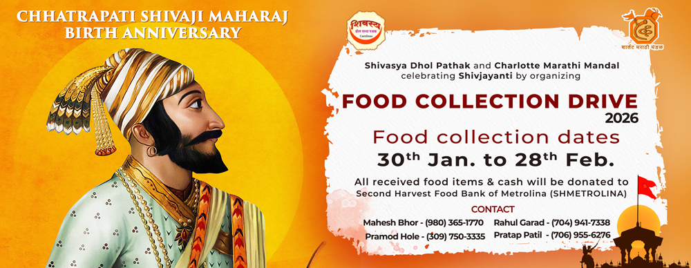🟠 Shivjayanti Food Donation Drive 2026 🟠 Shivjayanti– Food Donation Drive 2026 As every year, Shivasya Dhol Tasha Pathak and Charlotte Marathi Mandal are coming together to celebrate the Birth Anniversary of Chhatrapati Shivaji Maharaj with great pride and enthusiasm. This year, let us make the celebration more meaningful by Read more